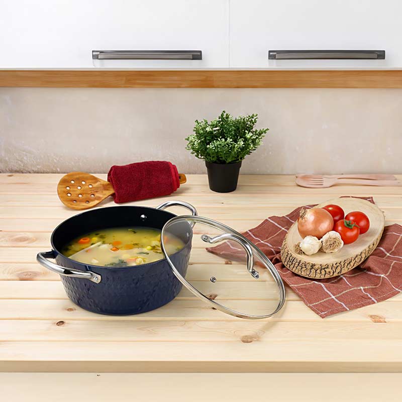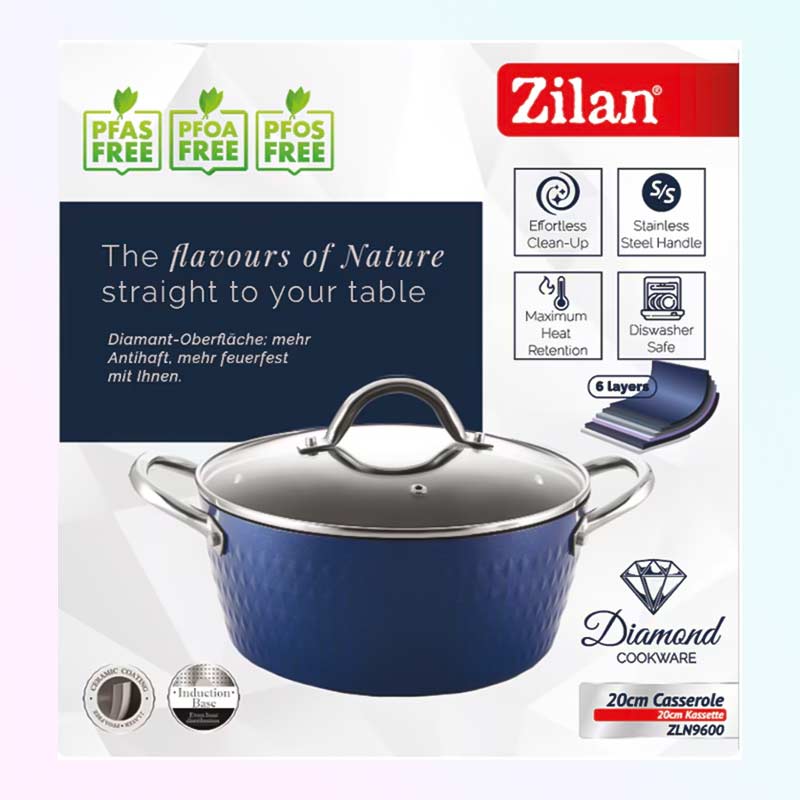 Диамантената тенджера ZILAN Ø20 см е висококачествен кухненски съд, проектиран за здравословно, ефективно и равномерно готвене. Благодарение на своята 6-слойна конструкция с диамантено покритие, тенджерата осигурява отлична топлопроводимост, дълготрайна устойчивост и минимално залепване на храната.