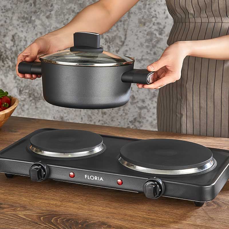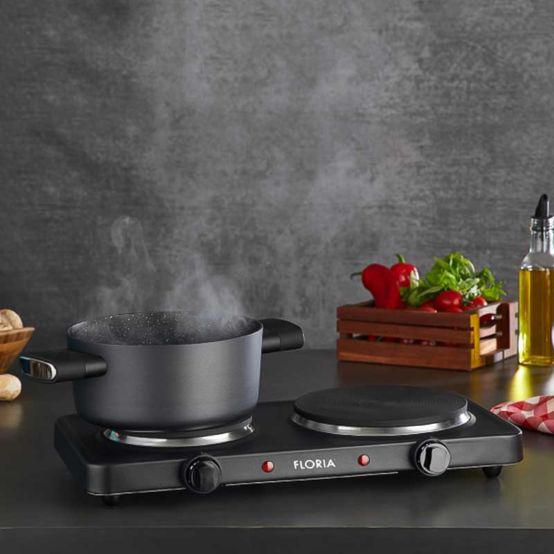 Двете горелки с различна мощност позволяват готвене на различни ястия едновременно, а регулируемият термостат гарантира прецизен контрол на температурата.