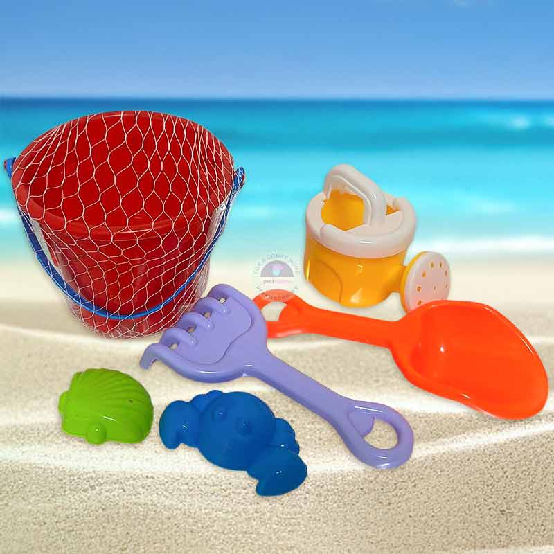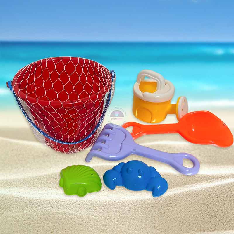 Практичен и забавен комплект за игра с пясък, включващ кофа, лейка, лопата, гребло и 2 формички. Създаден специално за активна игра на открито – на плажа, в градината или пясъчника.