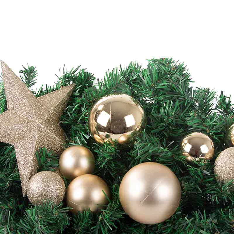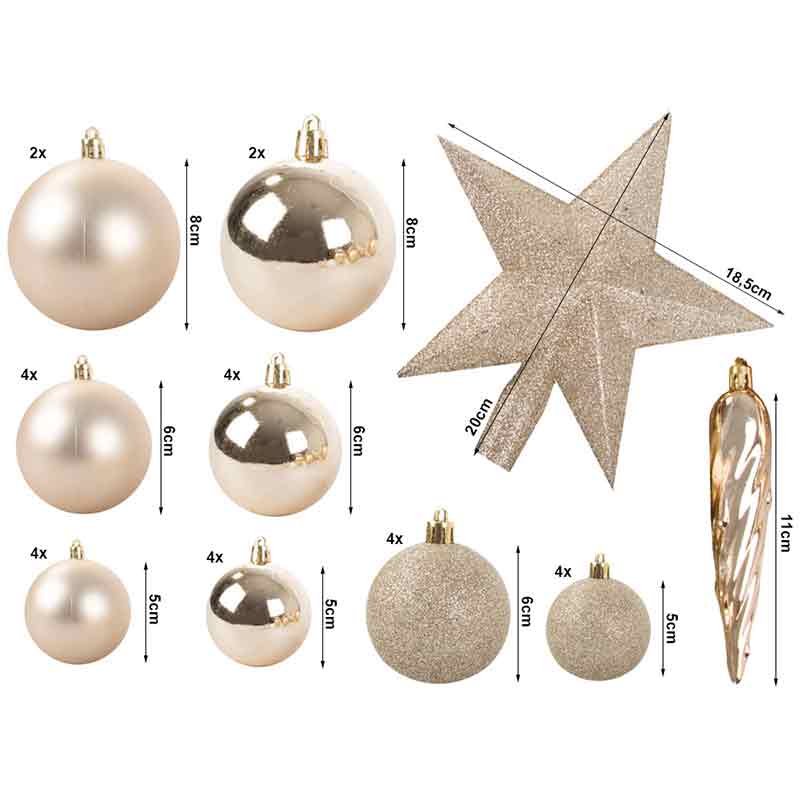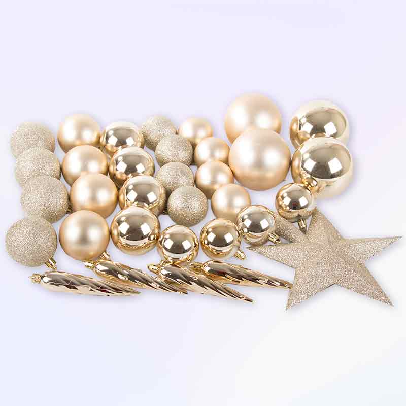 Коледната елха и декорациите ѝ създават празнична атмосфера. Комплектът включва пластмасови топки в различни размери и звезда от Витлеем. Те украсяват елхата и внасят блясък във всяко помещение.