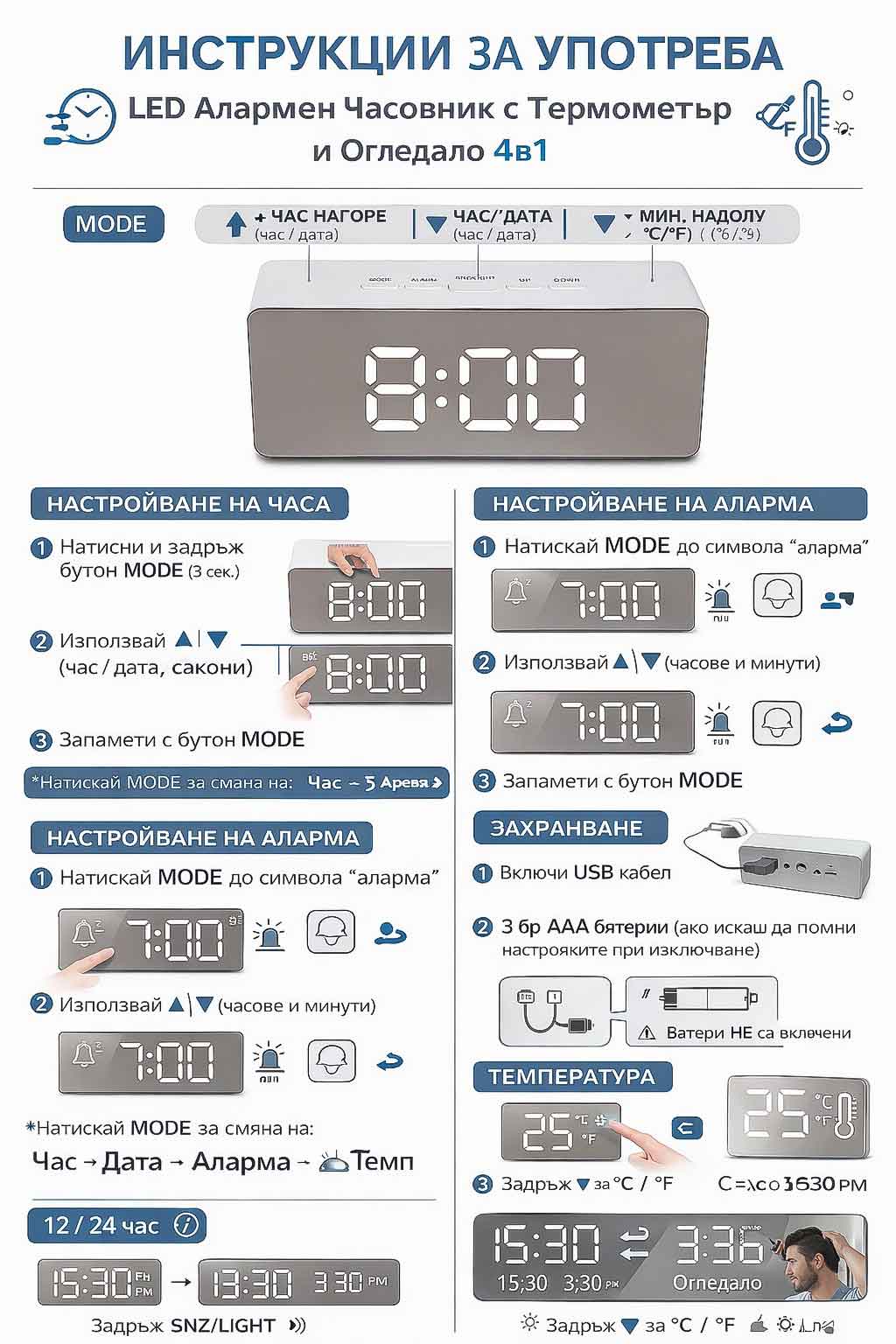 Можеш да избереш между 12h и 24h формат чрез Mode.