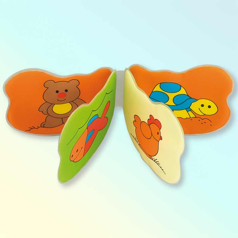Книжката съдържа 8 цветни страници с весели изображения. Изработена е от безопасен термопласт, без PVC и токсични вещества, което я прави напълно подходящи за бебета и малки деца.